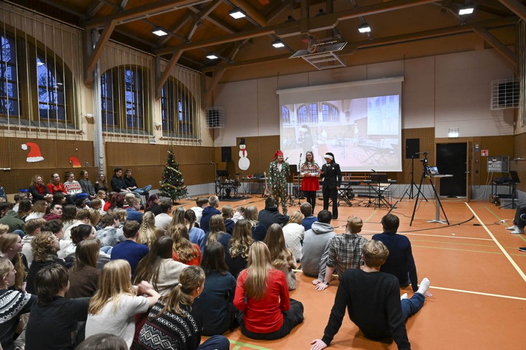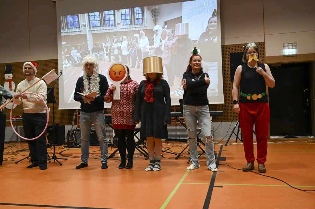 På julfesten i år den 20.12.2025 fick vi njuta av flera stämningsfulla musikuppträdanden, den legendariska Bertelgalan, en humoristisk Vill du bli miljonär-pjäs, härlig allsång samt ett traditionellt lärarprogram där studerande fick klura ut vilket ord lärarna föreställde.